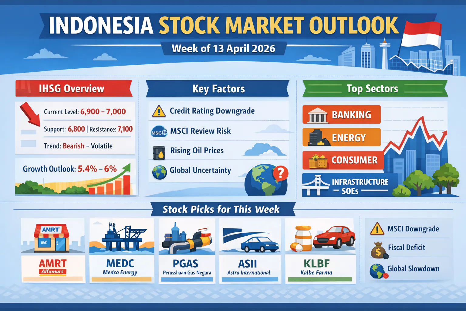 Infographic of Indonesia stock market outlook April 2026 showing IHSG levels, key risks, sector analysis, and top stock picks including AMRT, MEDC, PGAS, ASII, and KLBF