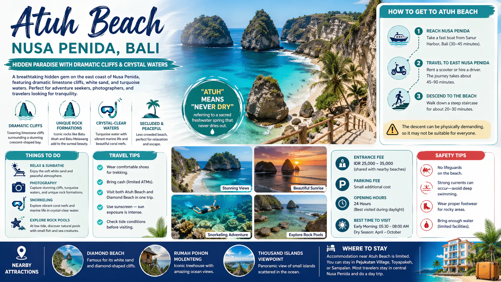 Located on the eastern coast of Nusa Penida, Atuh Beach is one of the most breathtaking coastal destinations in Indonesia. Known for its dramatic limestone cliffs, turquoise waters, and pristine white sand, this beach offers a unique blend of adventure and serenity.