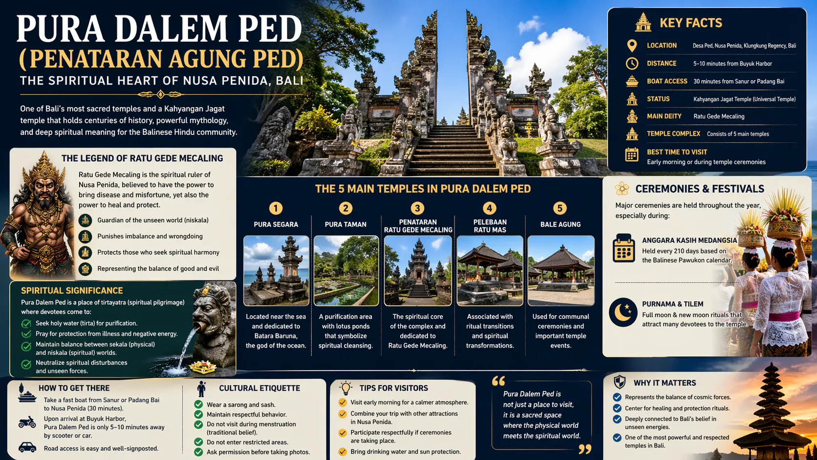 Located on the mystical island of Nusa Penida, Pura Dalem Ped (Penataran Agung Ped) stands as one of the most sacred and spiritually powerful temples in Bali. Unlike typical tourist attractions, this temple is deeply rooted in Balinese Hindu cosmology, mythology, and spiritual practices.